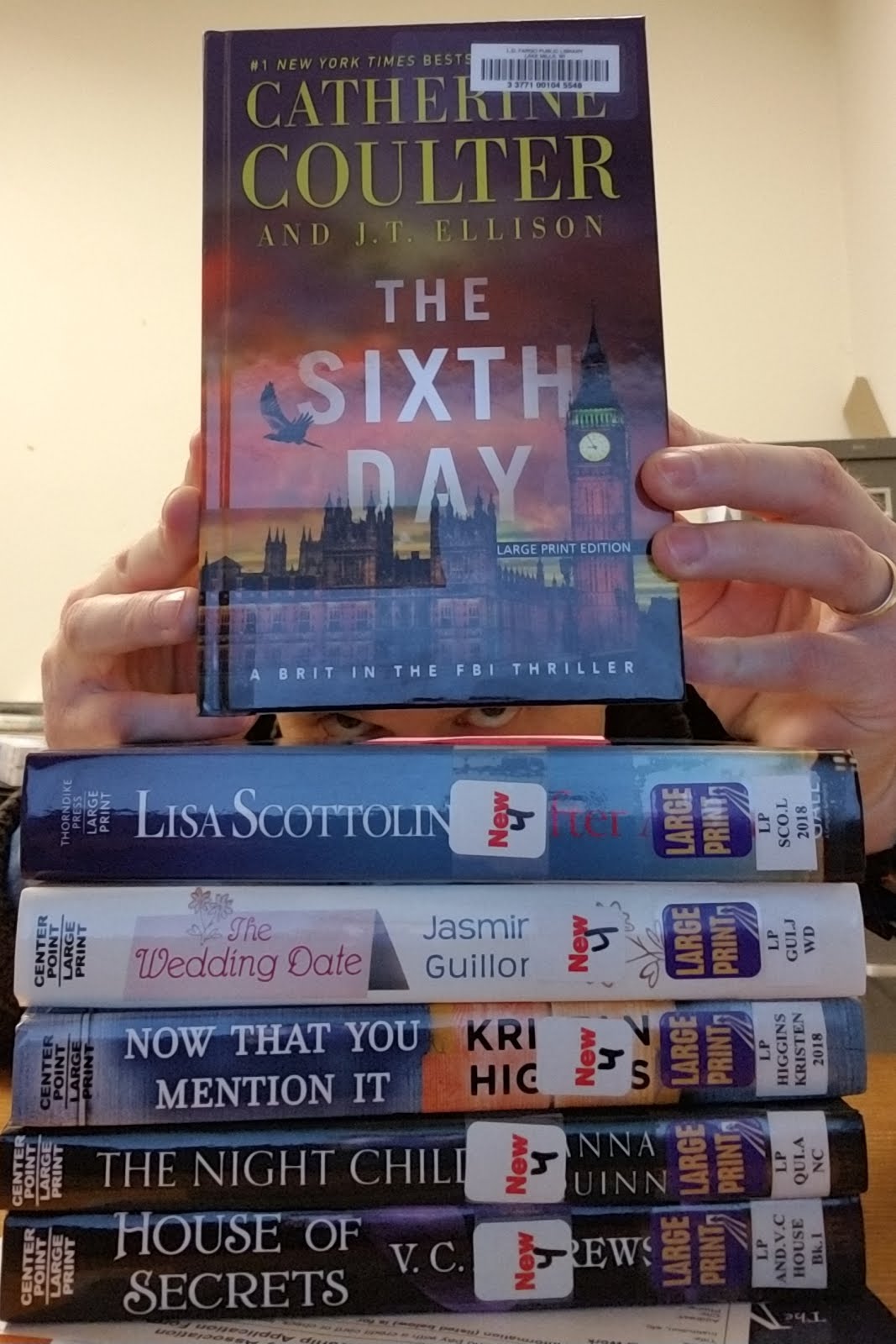 The Sixth Day by Catherine Coulter and JT Ellison. JT Ellison sounds familiar but I think I am confusing her name with that of an actor. Ellison lives in Nashville. A library customer spoke about his recent trip to Nashville and how much he enjoyed the live music venues.